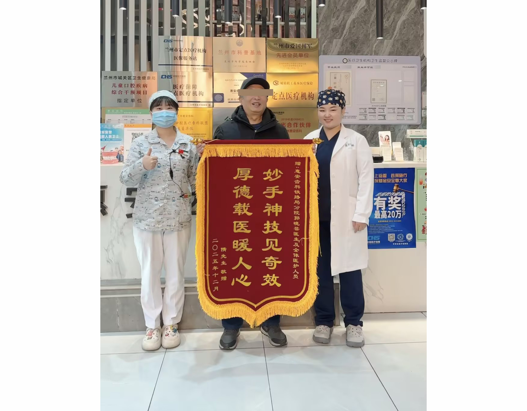 近日,兰州惠安齿科(铁路局院区)的郭晓芸主任及医护团队,收到了一份饱含深情的礼物——顾客隋叔叔专程送来的一面感谢锦旗。锦旗上简短的字句,凝结着一段温馨的医患故事,...